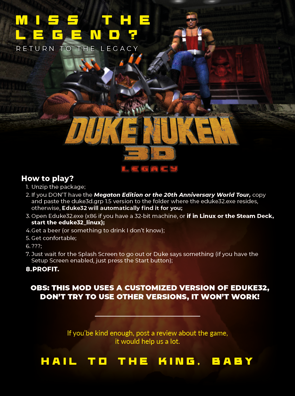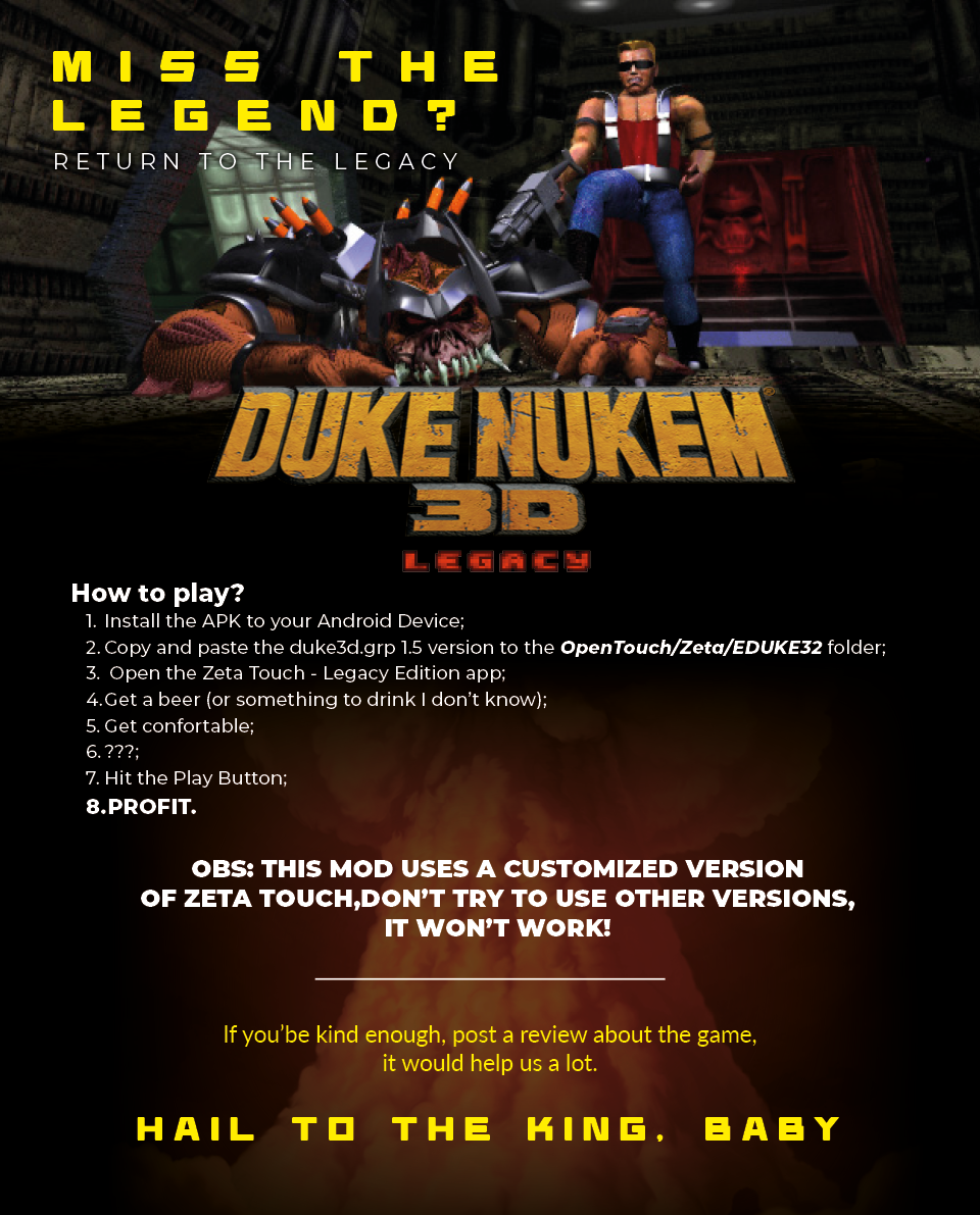 Duke Nukem 3D: Legacy Edition amps up the classic with a thrilling blend of the original's prototype ideas and modern mechanics, making for an intense challenge. Strategic smarts, agility, and a readiness to tackle hordes of aliens are crucial. This mod isn't just a game; it's a test of survival and skill, demanding quick thinking and quicker reflexes. It's an electrifying, action-packed homage to Duke's legacy, inviting you to dive into battle and push your limits like never before. Get ready for an unforgettable adrenaline rush!